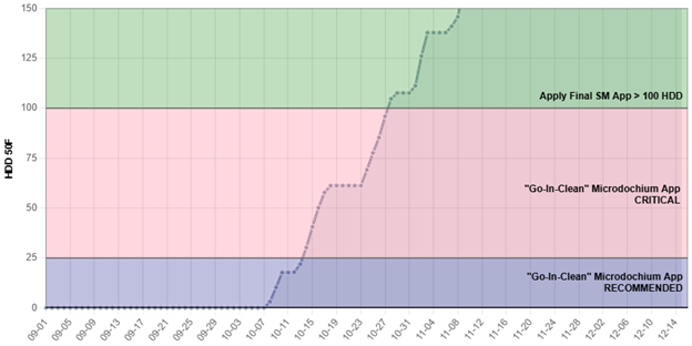 In medium to high pressure areas, it is recommended to go into winter clean – this means using a “Going-in clean” primer application 3-4 weeks before your final snow mould app. Knocking down fall inoculum drastically reduces disease pressure going into winter, making this strategy your optimal defense against the snow mould pathogen. Use Envu’s Turfview™ app to determine your best Go-in clean window. Turfview uses multiple weather stations, allowing for a location specific weather app for your specific microclimate, helping you determine the optimal Go-in clean timing.